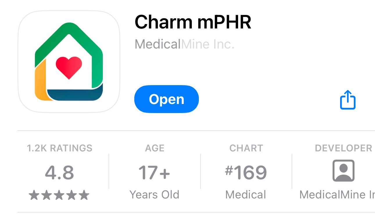 First, download the app from your app store “Charm mPHR”. Login with the username and password you set up when you received a link to get registered for the portal.